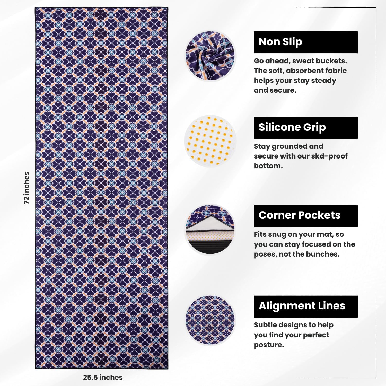 - Alignment Made Easy: Hidden alignment lines blend seamlessly into the towel’s ornate design, helping you perfect your posture with style.
